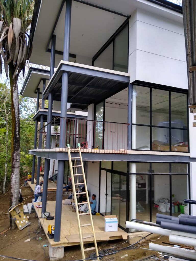El proyecto «Villas Santa Teresa» ejemplifica nuestra destreza en la construcción modular/vertical en entornos de alta vegetación. Este complejo residencial se caracteriza por el uso eficiente de una estructura metálica expuesta, que permite la creación de volúmenes limpios y un rápido avance de obra.