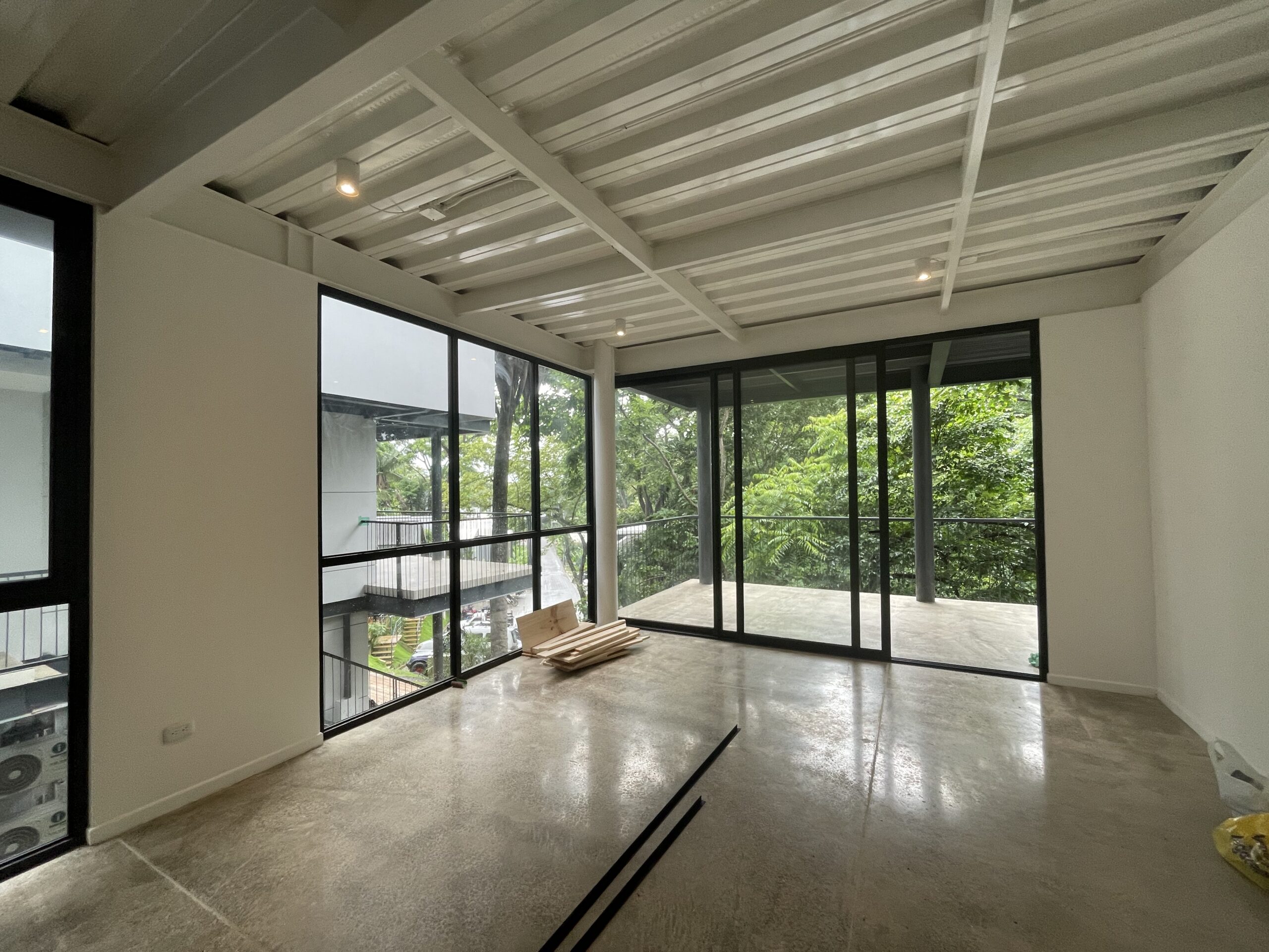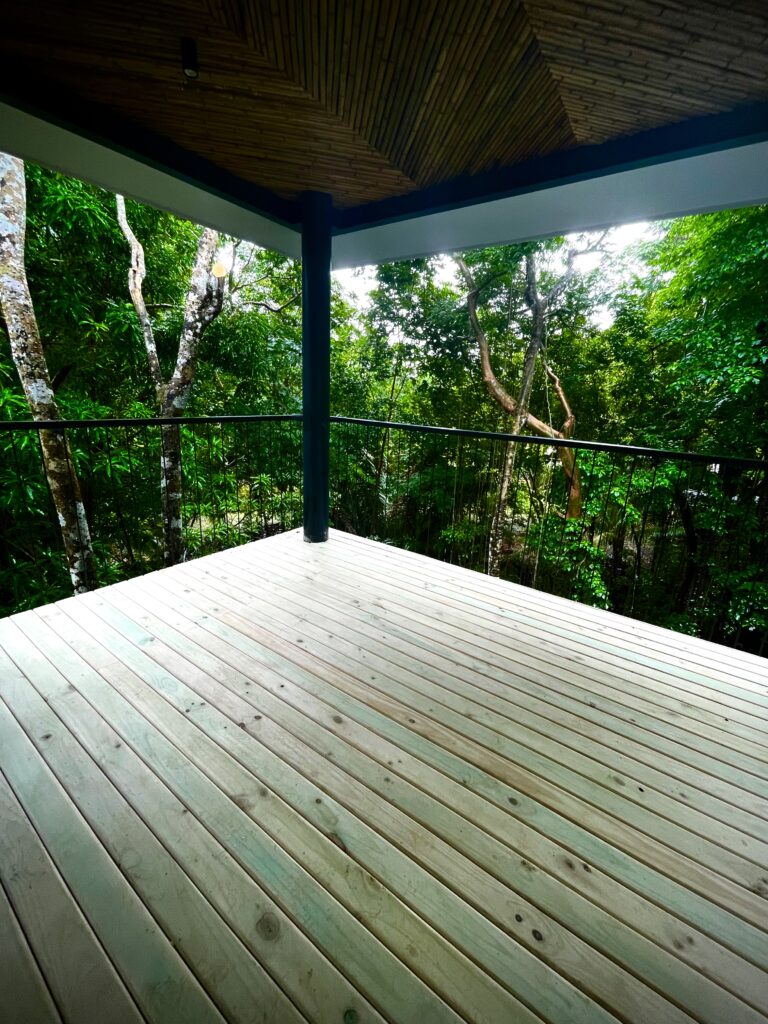 El diseño maximiza la conexión con el entorno natural mediante amplios ventanales de piso a techo y balcones/terrazas en cada nivel, ofreciendo vistas inmersivas a la selva. Los acabados interiores reflejan un estilo moderno e industrial, con pisos de concreto pulido y techos de estructura metálica abierta, complementados por la calidez de la madera en las cubiertas de las terrazas. Este proyecto es un testimonio de nuestra capacidad para construir estructuras multinivel, eficientes y estéticamente atractivas, que responden a las tendencias de la vida moderna y la sostenibilidad visual en el trópico.